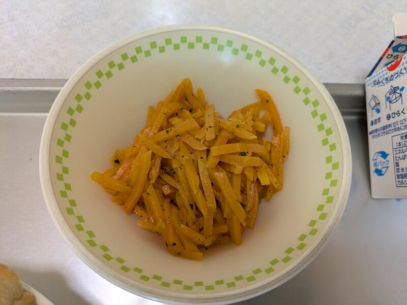 キャロットラペは、繊切にした人参をりんご酢で甘酸っぱく仕上げられていて、子どもたちが、食べやすいようにしてありました。食べながら身体が健康になっていくように思いました。