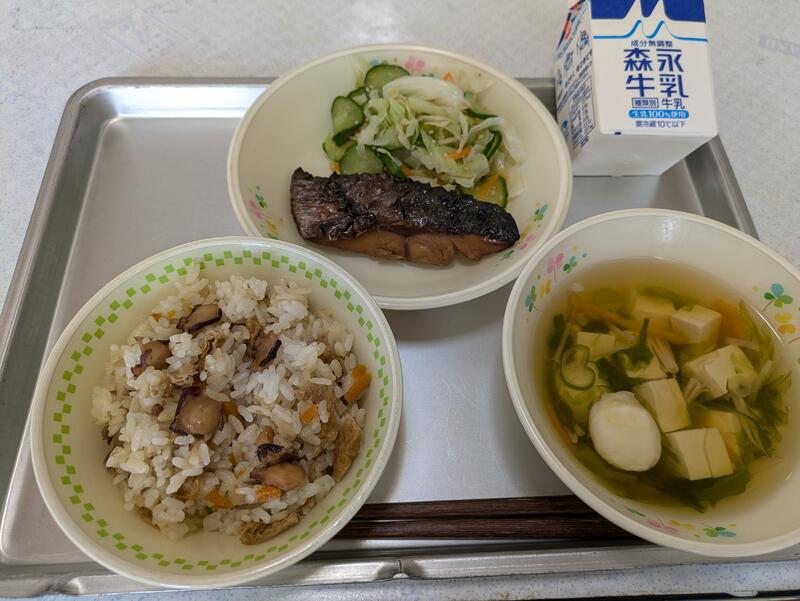 たこ飯、あおさ汁、鰤の照り焼き、酢味噌あえ、牛乳でした。