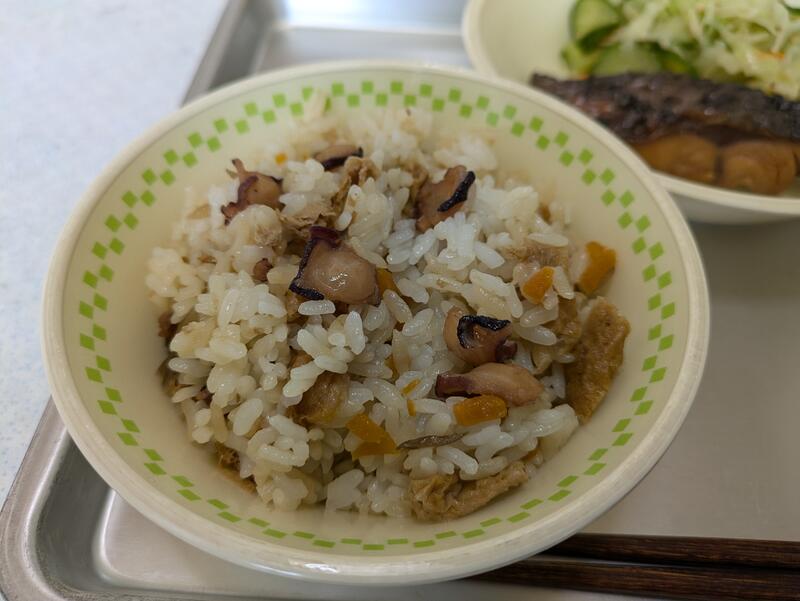 横島小のたこ飯は、細かく刻んだ干し蛸と人参、ごぼう、油揚げを生姜醤油で甘辛く味付けたご飯で、何杯でも食べたくなるおいしさでした。