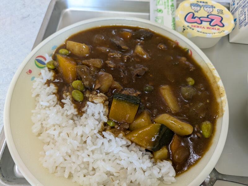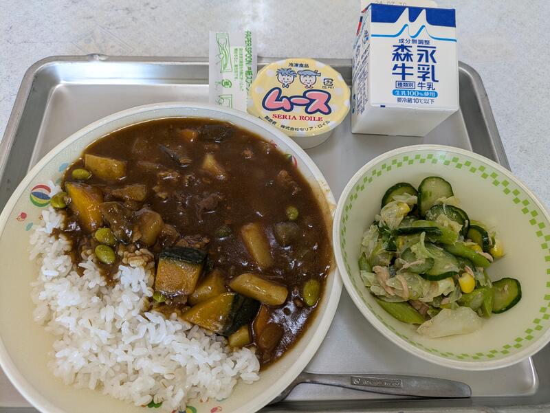 今日は、子どももおとなも大好きなカレーで、今月の献立表をもらった時からチェックしていました。横島小の夏野菜カレーは、2年生が生活科で栽培した茄子とピーマンが入れてありました。自校給食だからできることで、おいしくてうれしいカレーです。それに南瓜や人参、ジャガイモ、玉ねぎと私の大好きな豚肉入りのスペシャル夏野菜カレーで、玉ねぎは、カレー粉で20分間も炒めてあり、そして、2種類のカレールーを使って味付けしてありました。大満足のおいしさで、麦ご飯がいつも以上においしくなり、“あっ”という間になくなりました。