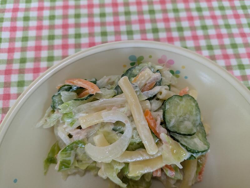 マカロニサラダは、キャベツや人参、胡瓜にツナとマカロニをマヨネーズでからめてありました。子どもたちが喜んで野菜をたくさん食べられるようにと給食の先生方が工夫して作ってくださいました。