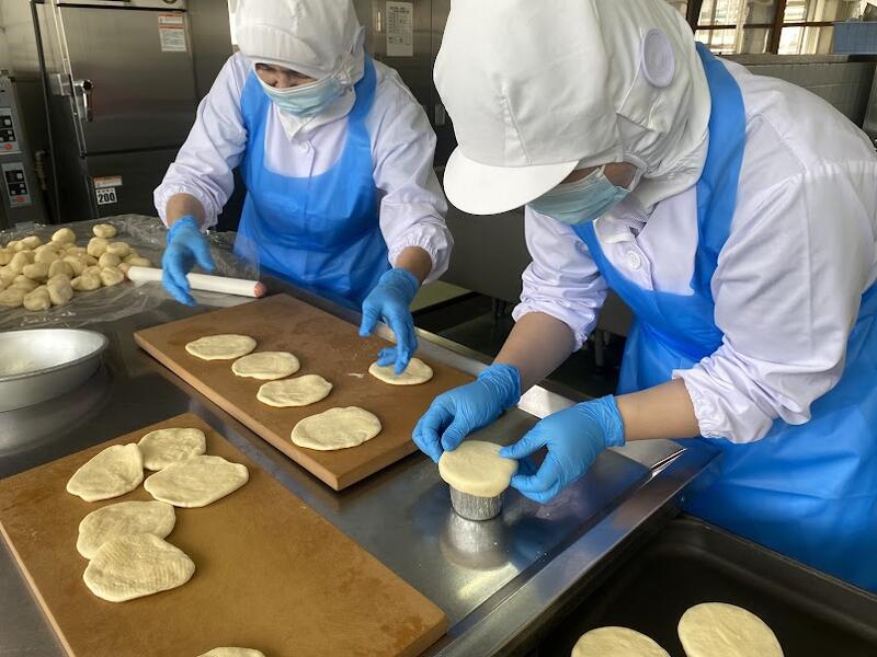 そのパン生地を、エノキタケとしめじのきのこに、玉ねぎと枝豆、チキンハム、豆乳の入ったクリームシチューにかぶせて鉄板に並べ、オーブンで焼きあげて作られます。