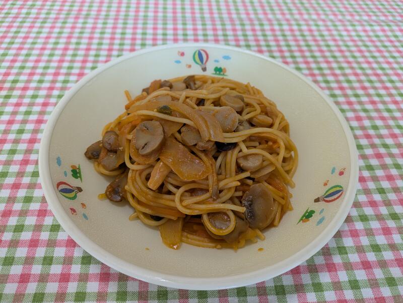 今日のメニューは、きのこスープ、ナポリタン、フルーツヨーグルト、牛乳でした。