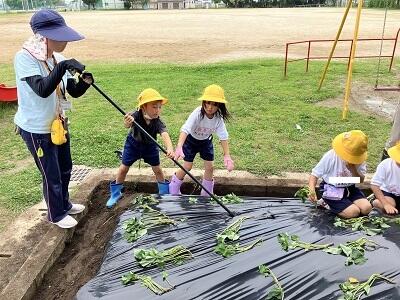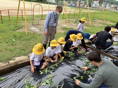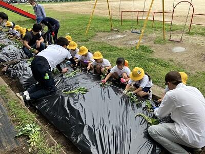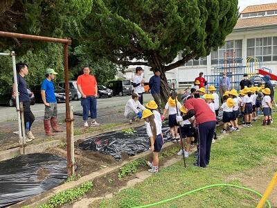 13日(火)5校時 1年生が生活科の学習で「芋植え」を行いました。講師には、横島町の4Hクラブの方々です。毎年、横島小学校のために米作りや芋植えなどを指導していただいています。