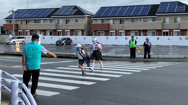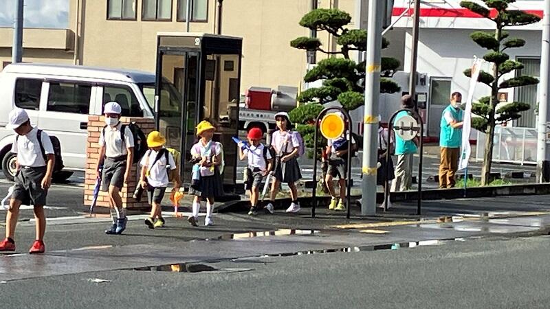 6月27日(火)朝の登校の様子です。保護司会の方3名、スクールガードボランティアの方4名が校門前、支所前、交差点の3カ所で登校の様子を見守っていただいていました。