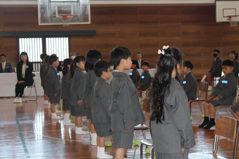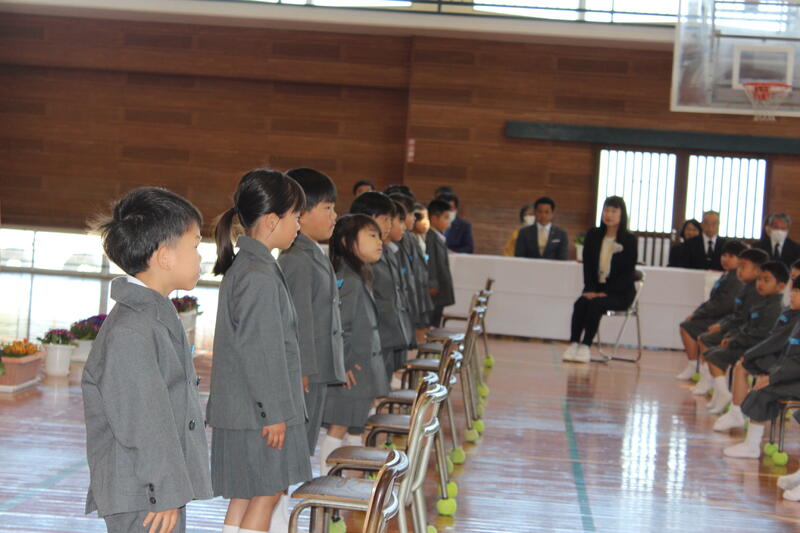 「1年生入場」の声とともに式場の体育館に入ってきた子どもたちは、緊張しながらも、はにかんだ笑みを浮かべていました。着席して、氏名点呼で一人ひとりの名前を呼ばれるとそれぞれの個性を表すような「はい」の返事をみんな言って、すてきな顔を見せてくれました。