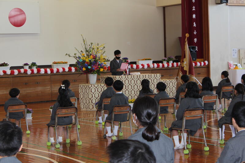 今年度は、29名の宝子たちが入学してきました。真新しい標準服と黄色い帽子、色とりどりのランドセルを小さな背中に背負って、横島小学校の校門を保護者と手をつないで入ってきました。お日様に照らされて、色鮮やかに咲く校門の花と校庭の桜の花が、入学をお祝いしているように見えました。なんともうれしく優しい光景でした。