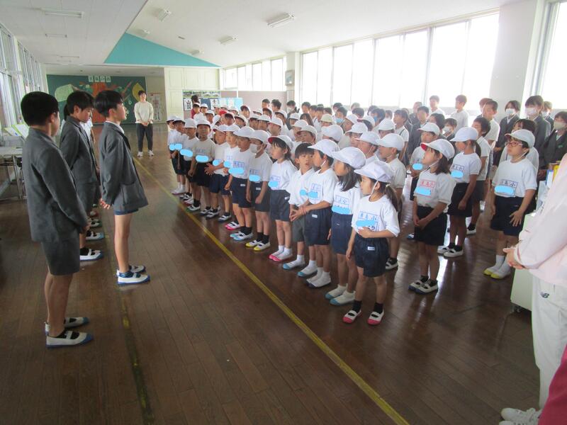 今日は、結団式を2時間めと3時間めの休み時間(学校では、業間と言います。)に全校児童が、赤団と白団に分かれて行いました。