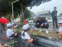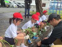 今日は天気にも恵まれて、絶好の苗植え日和でした。事前に4hクラブの方々が畑の草取りをされており、きれいな畑ができていました。1年生の子供たちは4hクラブの方々の説明を注意深く聞き、楽しそうにていねいに苗を植えていました。