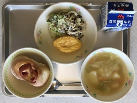 今日のメニューは、①手作りハムロールパン ②ポトフ ③オムレツ ④かみんこサラダ ⑤牛乳です。