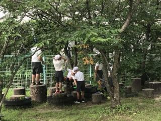 7月13日(月) 朝、ひまわりの草取りをしてくれている子供達と、虫取りをしている子供達です。セミを2匹捕まえていました。