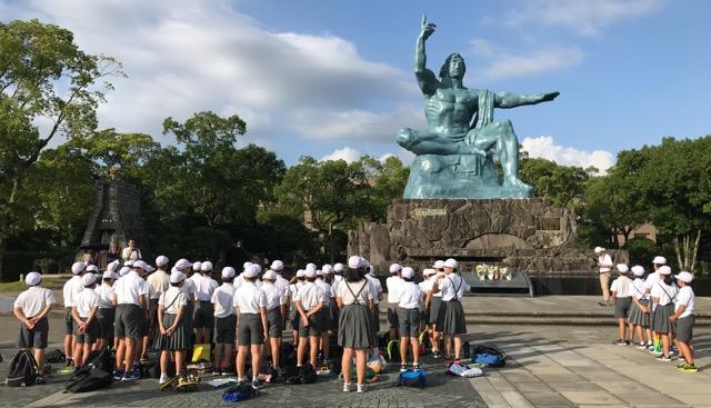 9月12日(木) 最後は平和公園での平和集会でした。みんなで平和祈念像の前で呼びかけをして千羽鶴を捧げました。力強く呼びかけをすることができました。