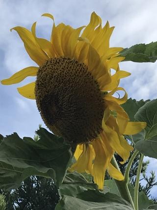 8月7日(水) 昨日の台風で多くのひまわりが倒れました。職員で立て直しましたが、大きくきれいなひまわりが1本、根元が半分切れているものがありました。写真は、そのひまわりです。多分日差しが強くなるとしおれて枯れてしまうのでしょう。残念です。