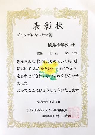 9月17日(火) 以前お伝えしていましたように民間企業が開催している「ひまわりのせいくらべ」というコンクールに3年生が中心となって参加していました。今年度の結果が出ましたのでお知らせします。全国で1349施設参加した中で、23位(3m68cm)でした。1位は、愛知県豊田市の佐切小学校の4m60cmでした。