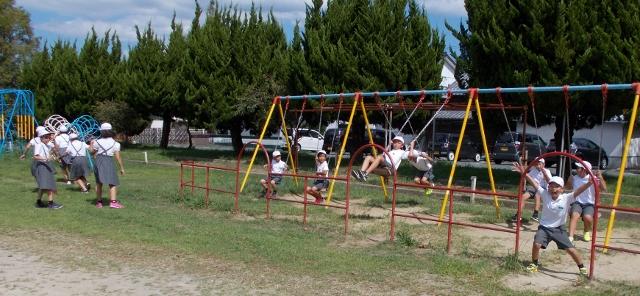 9月17日(火) 今日の昼休みの様子です。とても強い日差しの中、子供達は、元気に外で遊んでいました。学びの森は木陰で涼しく、青い空が気持ちよかったです。