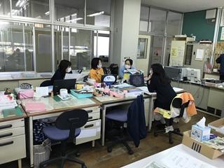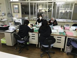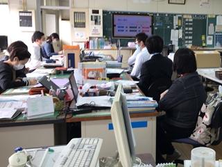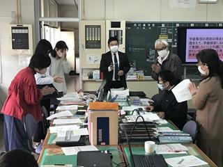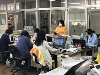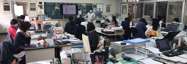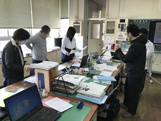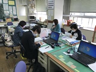 4月21日(火) 20日より在宅勤務が始まりました。研修や家庭訪問の合間を縫って、本校では、職員を2つのグループに分け、交代で仕事を自宅で行うようにしました。半日ずつの合計2.5日分です。学校経営案と教育諸計画のデータを持ち帰り、仕事を行っています。支援員さんや調理員さんは、調理室、ランチルーム、各教室のエアコン、校舎の窓、校舎周りの草取りなど大掃除をして頂いています。写真は、午前中行ったUDの6原則(行動科学の原則、障害特性の原則)の研修の様子と草刈りをした学級園の様子です。研修は、職員室の換気とマスクをして、少し距離をとって行っています。