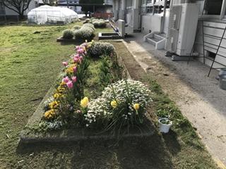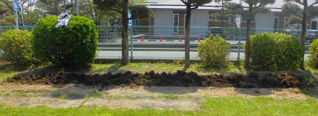 4月19日(日) ひまわりのせいくらべというイベントがあります。昨年度も参加して、3m68cmで全国23位でした。今年度も参加します。運営委員を中心にゴールデンウィーク明けに植え付けを行う予定です。そのための準備をしました。グリーンステージの片隅にミニ花壇を作って、7本のひまわりを育てます。まず耕して、50cm?ぐらいの深さの穴を掘り、堆肥を入れて、埋め戻し低い畝を作りました。