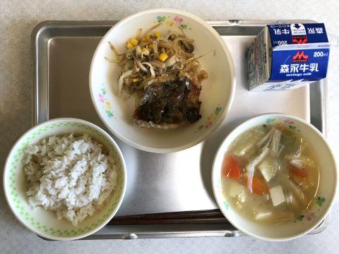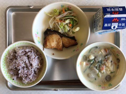 今日のメニューは、①ざっこくご飯 ②ぶりの照り焼き ③甘酢あえ ④ごじる ⑤牛乳です。
