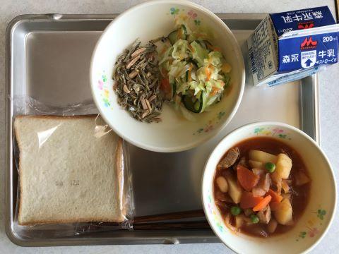 今日のメニューは、①食パン ②ポークビーンズ ③コールスローサラダ ④いりことアーモンド ⑤牛乳です。