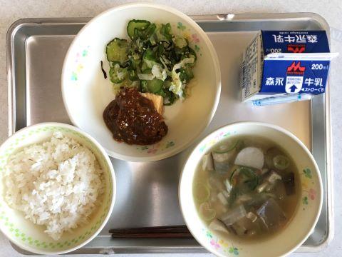 今日のメニューは、①豆腐の肉みそあんかけ ③昆布あえ ④のっぺい汁 ⑤牛乳です。