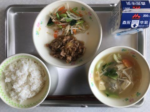 今日のメニューは、①むぎごはん ②豚肉のしょうが焼き ③ピーナツあえ ④つみれ汁 ⑤牛乳です。