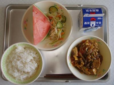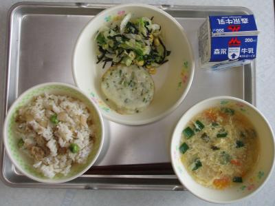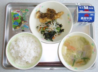 メニュー ①むぎごはん ②魚のネギソースかけ ③ワカメのすのもの ④味噌けんちん汁 ⑤柏餅 ⑥牛乳