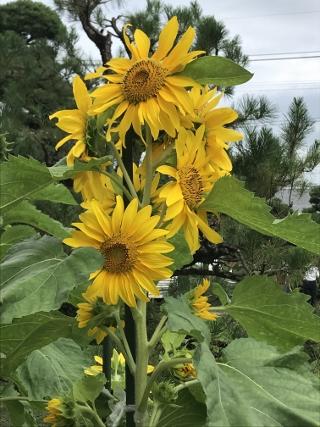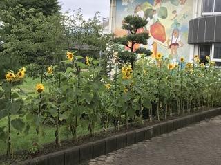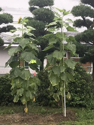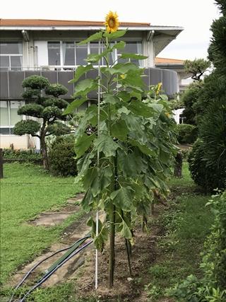 7月26日(日) 一番高くなっていたひまわりが咲きました。最高到達点は、3m33cmでした。残年ながら4mには届きませんでしたが、大きくてきれいな花を咲かせてくれました。早く咲いた花は、花が大きくなりすぎて頭をたれています。3年生がお世話をしているひまわりも8割方咲きました。白い棒の長さが3mです。