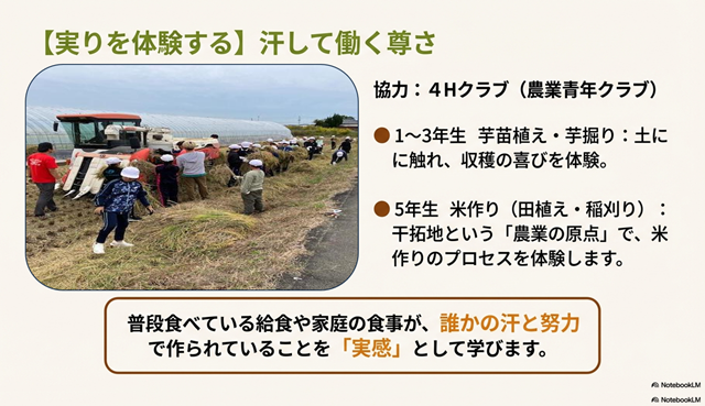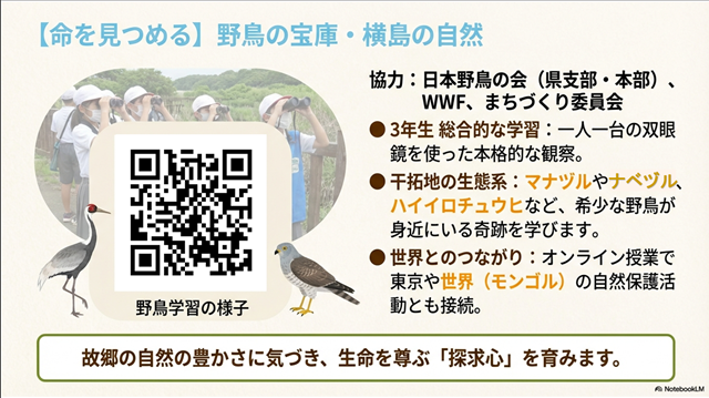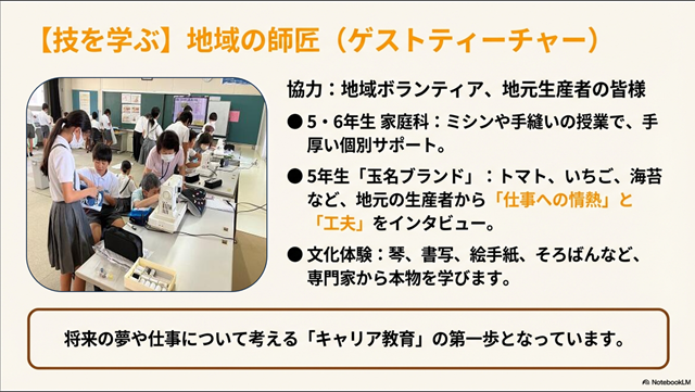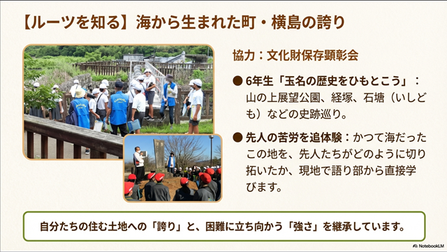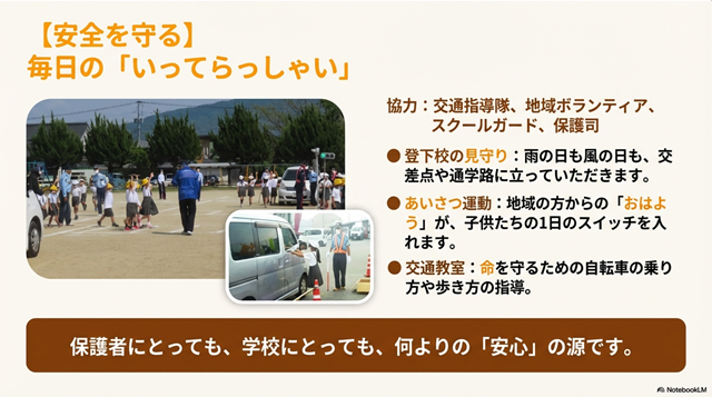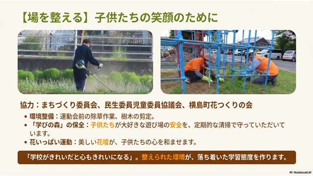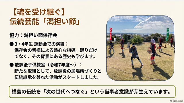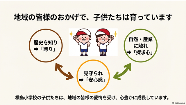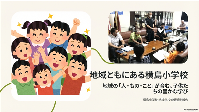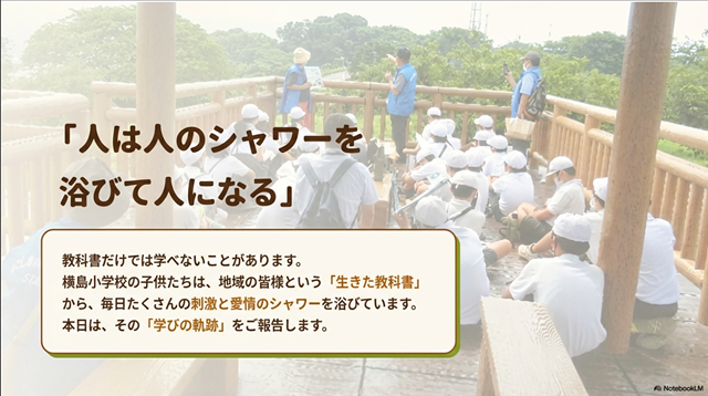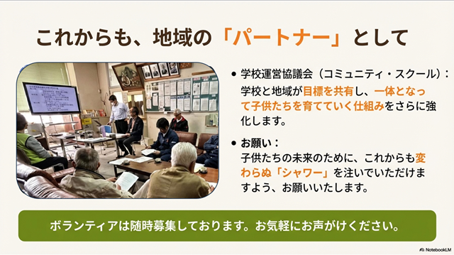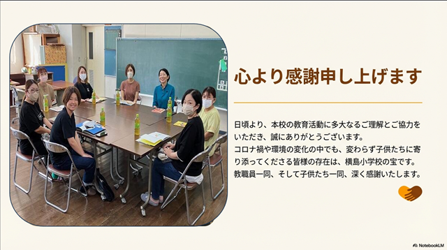 ◇2番の地域学校協働活動の振り返りで使用したスライドを掲載します。このスライドは、今までの「ふれあい笑顔」を、Notebook LMというAIに読み込ませ、横島小学校の地域学校協働活動についてまとめさせたものです。最近のAIの進化はものすごく見事にまとめてくれています。