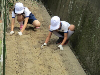 まず、一列に並んで、歩きながら種を蒔くところに溝を作っています。