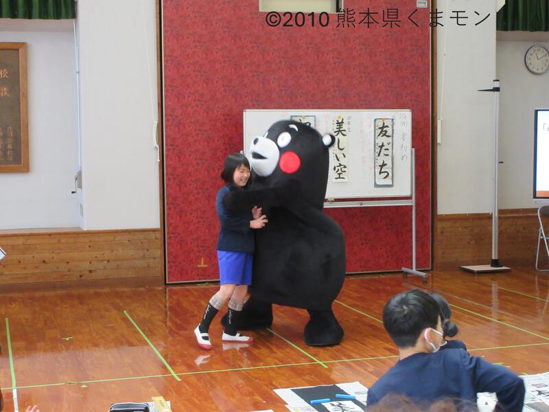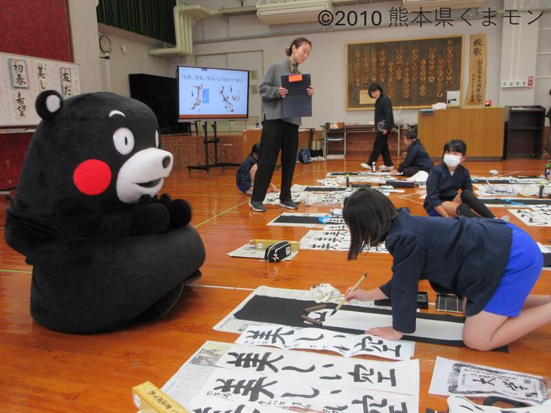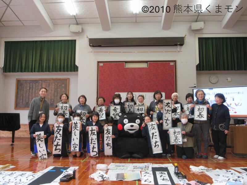 令和8年1月19日(月)に鶴の子スクールがあり、3・4年生とスクール生のみなさんで書初めを行いました。するとそこに、なんとスペシャルゲストが登場!くまモンがみんなの書初めの手伝いに来てくれました。子供たちにたくさん関わってくれて笑顔いっぱいの書初めの時間となりました♪