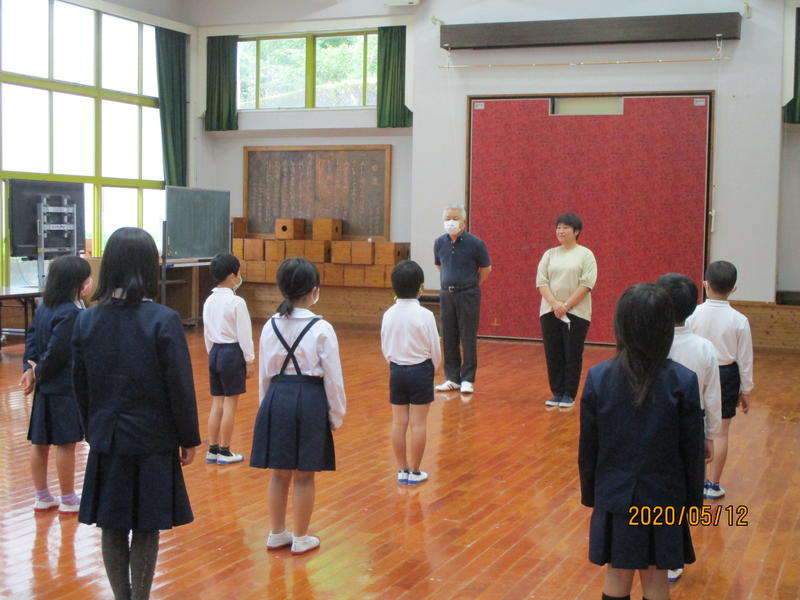 5月11日(月)から、待望の学校用務員の先生が着任しました。顔をお知らせしておいたほうがよかろうということで、窓を開け、ホールにめいいっぱい広がってほんの3分ほどの集会を開きました。