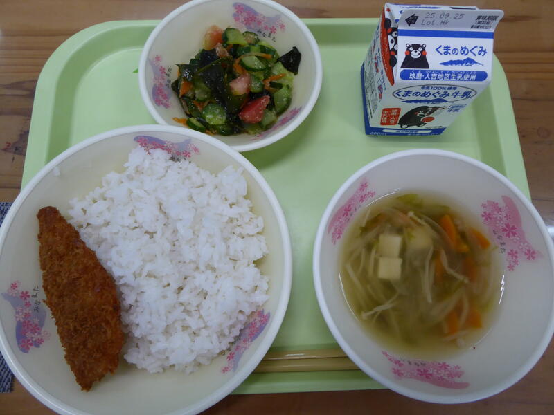 9月11日(木)は湯出小学校のリクエスト給食で、夏が旬の食材を使った和食メニューを考えました。メニューはあおさ汁、きゅうりとトマトの酢の物、アジフライ、麦ごはん、牛乳でした。夏野菜のきゅうりやトマトには体温を下げる働きがあります。日中は気温が高く、まだまだ暑い日が続きます。バランスよく食べて、二学期も元気いっぱいすごしてほしいです。