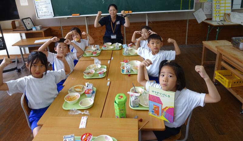 本日の給食では、1年生の国語で現在学習中の「サラダでげんき」に登場するりっちゃんがつくったサラダを食べました。りっちゃんにいろんな動物たちが食材をくれてできた、栄養満点のサラダになります。湯出小学校のみんなも元気になりました!