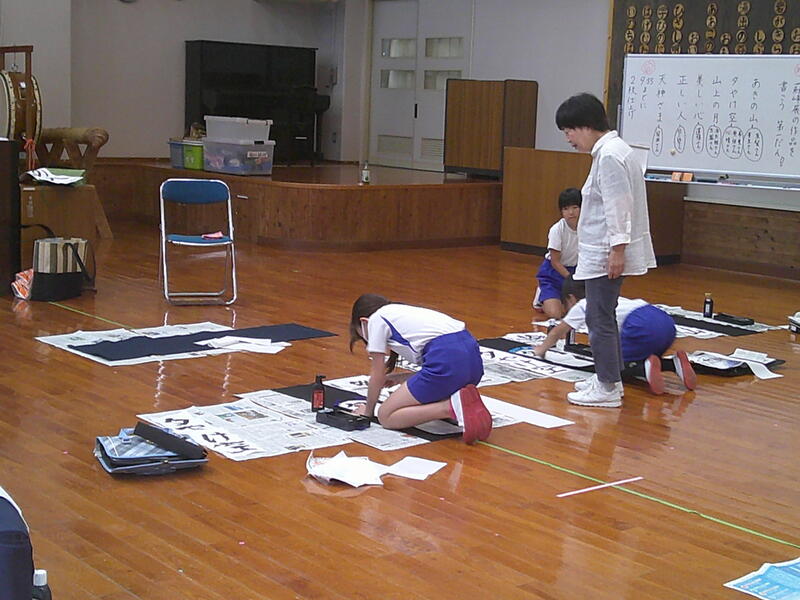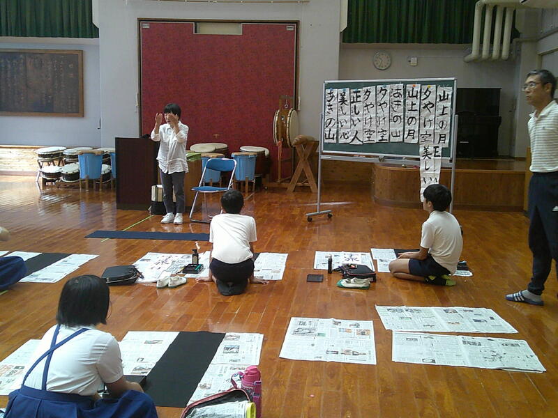 17・18日に3年生から6年生の書写支援として、荒木先生にお越しいただき直接ご指導をいただきました。今回は、多目的ホールにて床の上での毛筆に挑戦しました。いつもの半紙とは違い条幅とあって難しさもありましたが、先生のお話を聞いて一字一字丁寧に書いていました。3年生にとっては、初めてづくしではありましたが「止め・はね・はらい」に気をつけて書くことができました。荒木先生のご指導のおかげで全員が立派な文字を書くことができました。