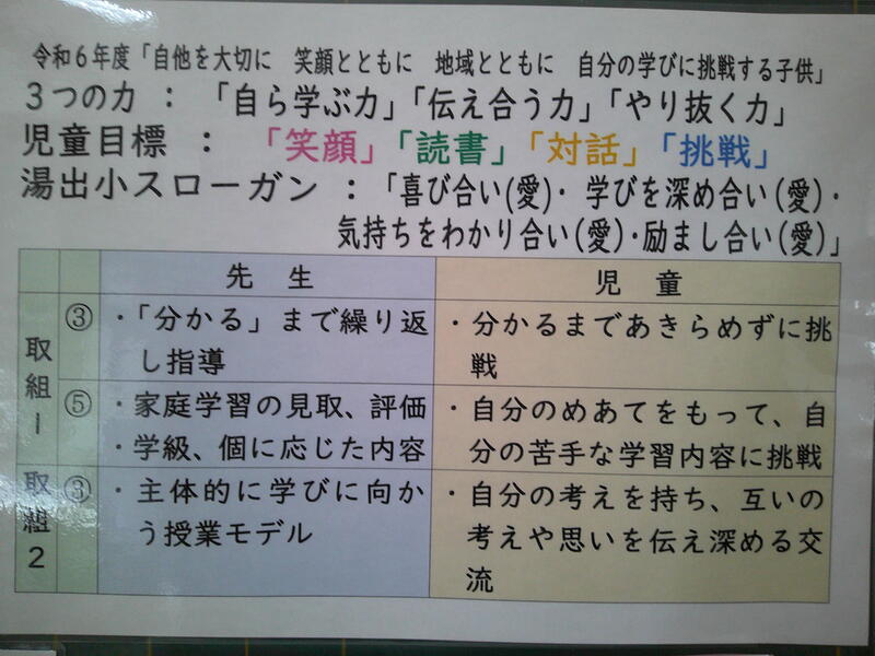 本校では、「児童が主体的・対話的で深い学びの充実を図る授業力向上の取組」を校内研修を核として、湯出小版学習モデル「ななたきっこ」や学習リーダの育成に努めています。1~6年生までの児童が、授業のめあてをしっかり理解し、解決するために自分の考えを持ち、互いの考えや思いを共有し、よりよい学びの実現に向けて、児童も職員も日々励んでいます。