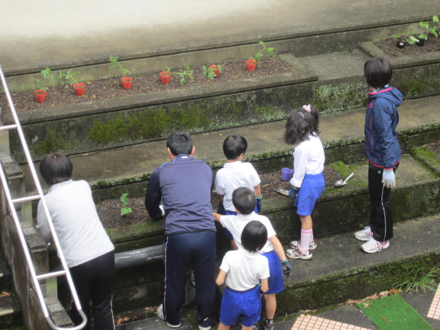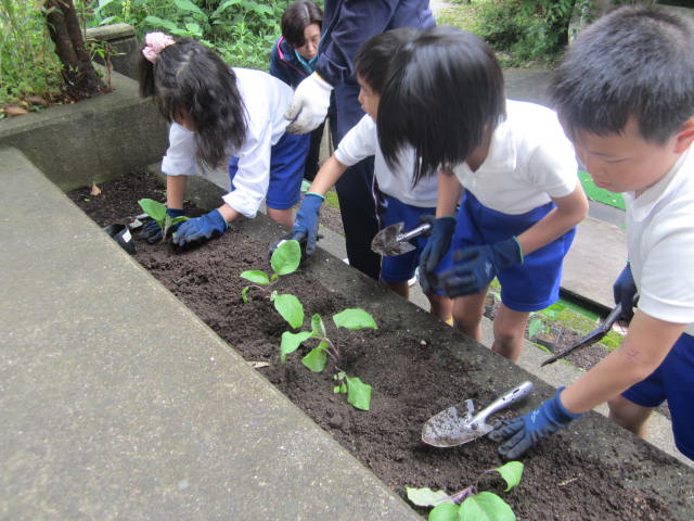4月30日(木)1・2年生は、学級前の花壇に、野菜の苗を植えました。ピーマン、きゅうり、なす、ミニトマトの4種類を植えました。おいしい野菜ができるようにこれからお世話をがんばります。