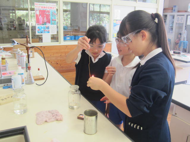 5月1日(金)6年生は、理科の実験で、酸素を発生させ集めた集気瓶の中で、ろうそくの火や鉄綿が燃える様子を観察しました。炎が明るくなり驚いていました。