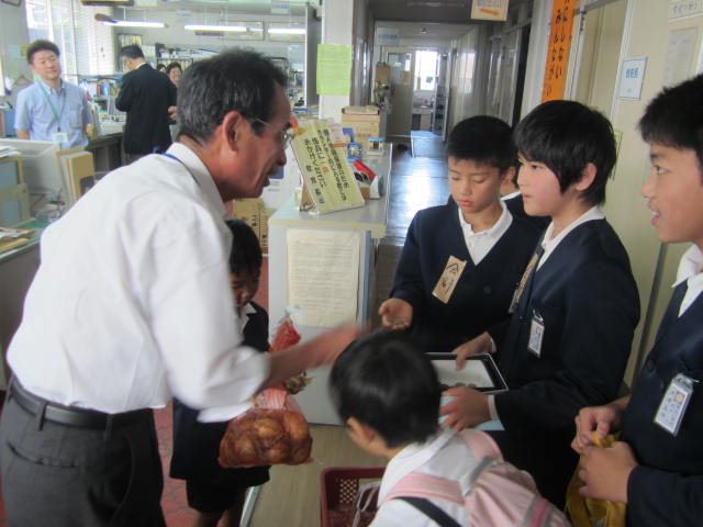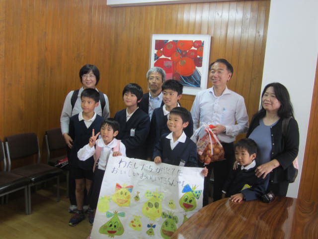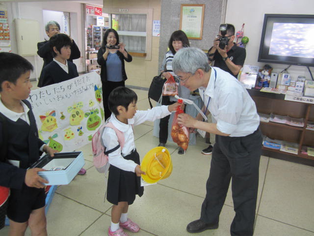 5月26日(火)たんぽぽ・ひまわり学級の子どもたちが市役所を訪れ、学校の畑で作ったサラ玉を販売しました。教育委員会や市役所1Fロビーで販売しました。用意した28袋完売しました。市長室も訪ねました。市長さんからはハガキをプレゼントされ、とてもうれしそうでした。