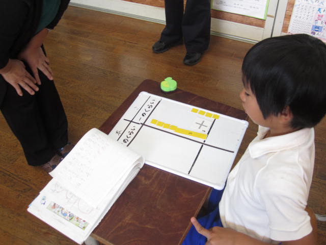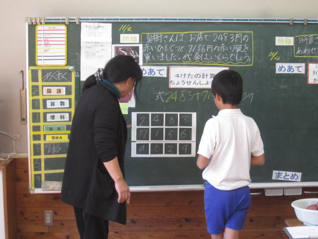 11月4日(水)ひまわり学級で、3・4年生の複式研究授業がありました。3年生は、「9+4」の計算の仕方を、4年生は、4桁どうしの足し算の筆算の仕方を学習しました。先生のお話をよく聞いて、集中して勉強することができました。