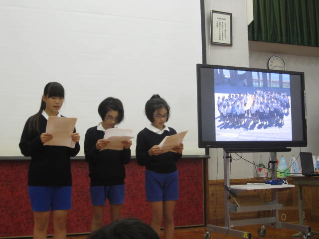 11月18日(水)児童集会がありました。夏休みのリーダー研修の報告がありました。校内で、ほめ言葉のシャワーや合い言葉の音楽についてみんなで確認し合いました。