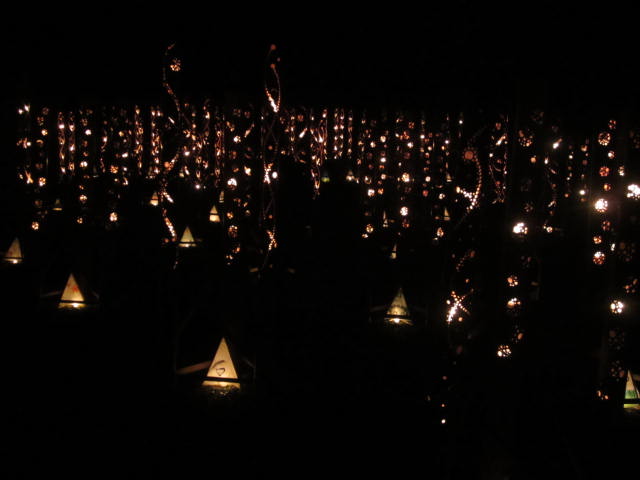 いました。子どもたちが作成した三角の竹灯りも暗闇の中で