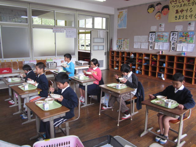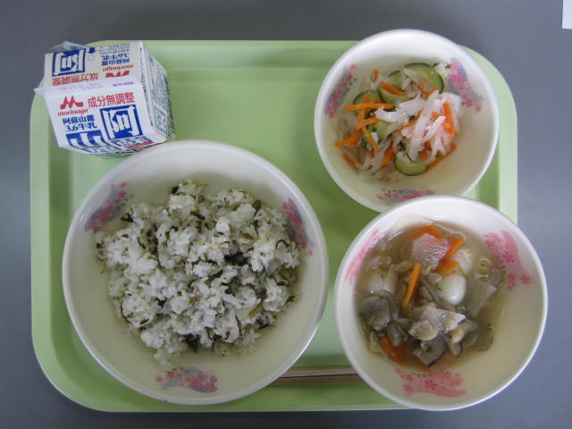 12月17日(木)今日の給食メニューは、高菜めし、白玉だご汁、なます、牛乳でした。3・4年生の教室に様子を見に行きました。みんなおいしく食べていました。今日も完食でした。