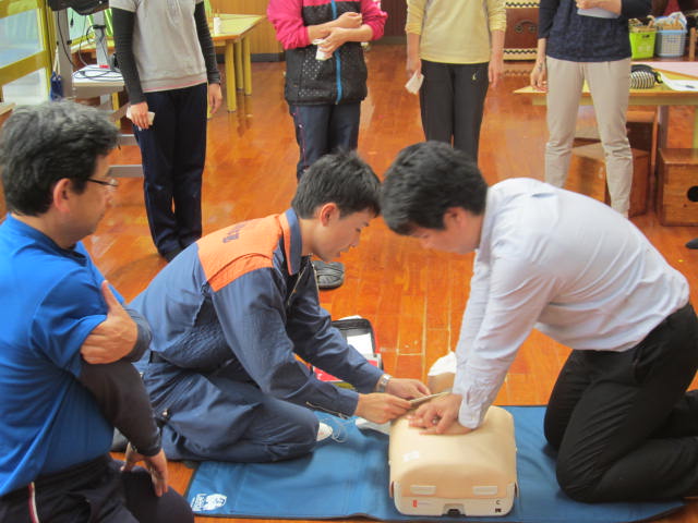 5月18日(水)救命救急講習を全職員で受講しました。消防署の救急救命士の方に一連の救命行動について学びました。実技指導では、一人一人のすばやい対応はもちろんのこと、連携の重要性を再認識しました。