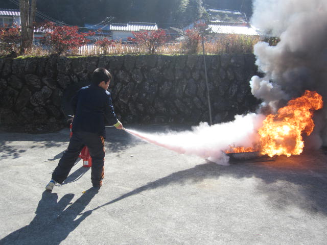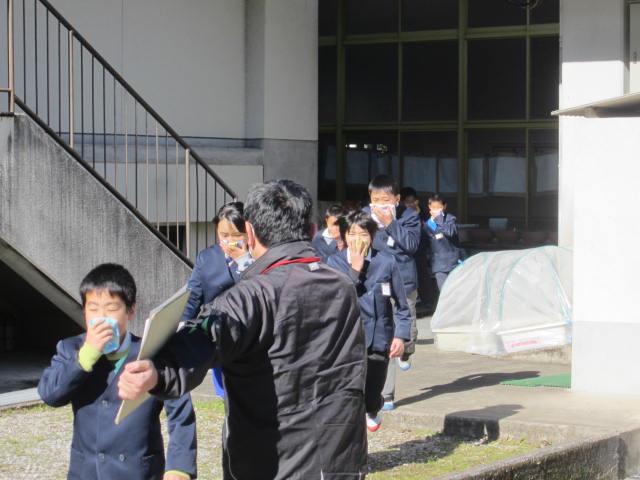 1月26日(木)火災避難訓練を行いました。素早く避難できましたが、少し声が聞こえました。郡山防災の方に消火器の使い方を指導していただきました。高学年の子どもたちが代表で体験しました。2月の避難訓練は100点になるように態度に気をつけてほしいと思います。