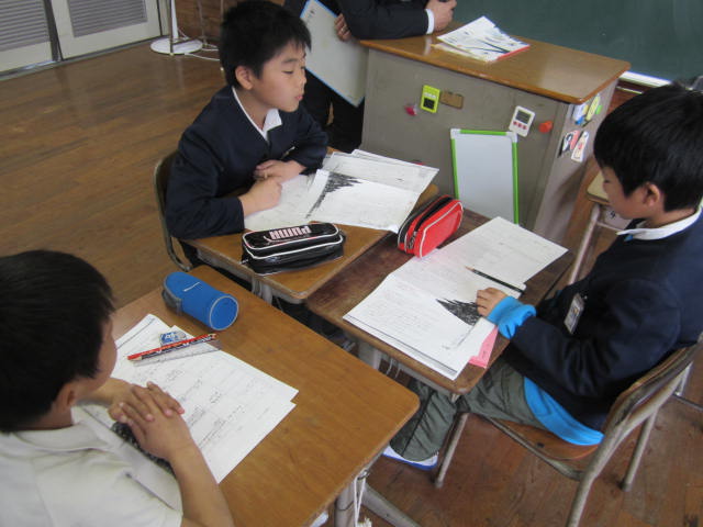 3人で対話する場面がありました。自分の考えを発表したり、違いや似