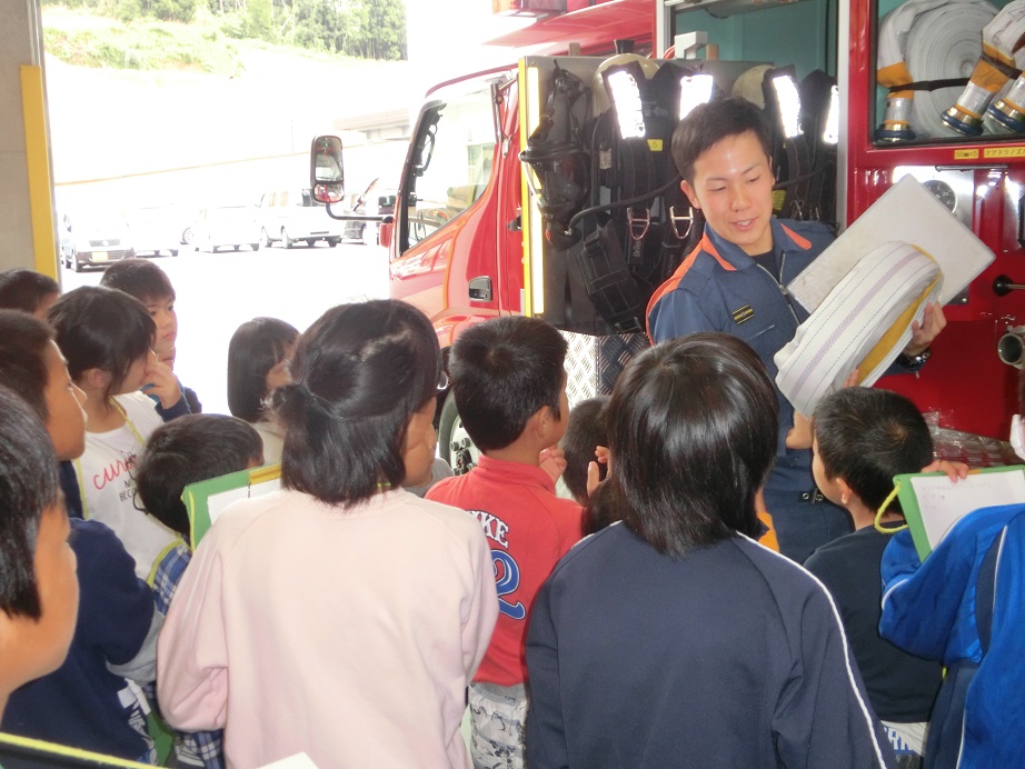 10月17日(火)、小雨交じりの中でしたが、1年~5年の20人の児童で、消防署と生協くまもと水光社本店に社会科見学に行きました。