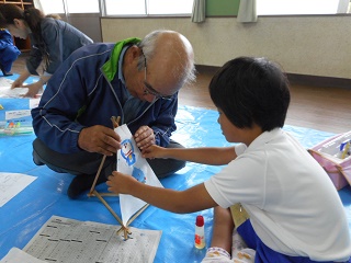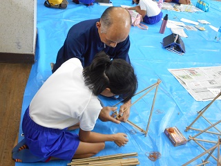 これは、竹ひごを三角にくみたてたり描いた絵をはったりしているところです。