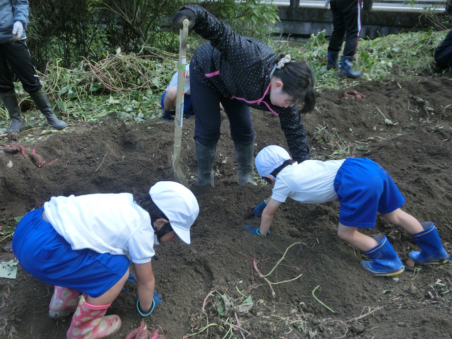 ずーっと楽しみにしていたいもほり。でも、掘ってみるまではあるかなあとドキドキでした。だからこそ、大きなイモがどんどん出てきた時は、「見て!見て!」の大連呼でした。子供たちはとっても嬉しかったと思います。