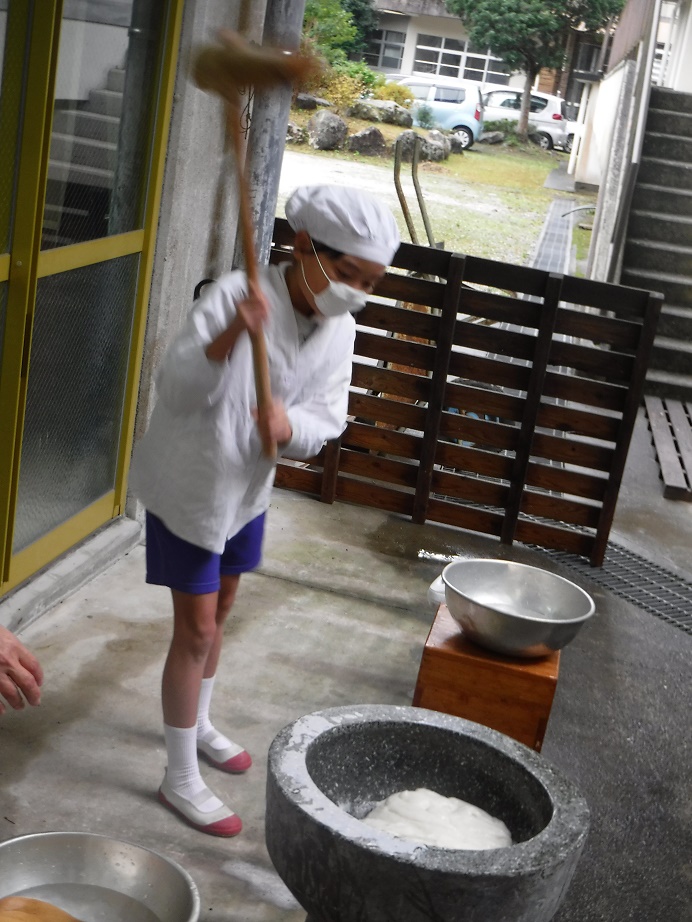 さて、子供たちの頑張りは・・・というと、まず、何よりも一生懸命掃除をしました。1・2年生も、玄関、廊下、多目的ホールを力を込めて隅々まで拭きあげました。3年生以上は、もち米を洗ったり、体育館やホールの掃除から机、いすならべ、食器等の準備まで「次は何をしましょうか」と主体的に動きました。