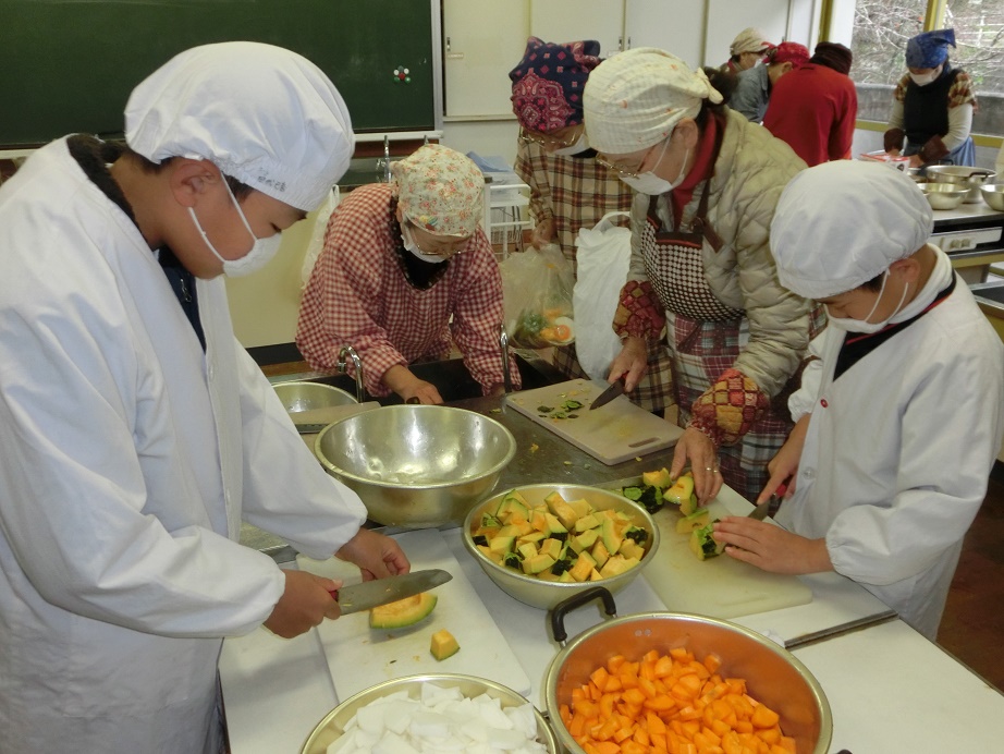 婦人会の方々とだご汁づくりをしている様子と会食の様子です。